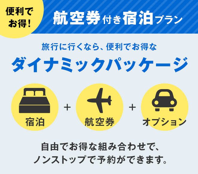 ダイナミックパッケージなら、自由でお得な組み合わせでノンストップで予約ができます。