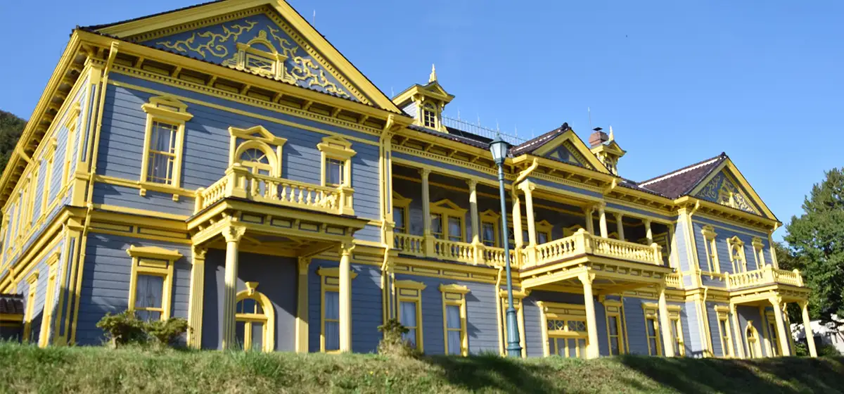 明治の面影を残す木造洋館。大理石の暖炉を備えた応接室、シャンデリアなど、内部にも当時の華やかさが漂う。ハイカラ衣装館で、クラシックなドレスを着て記念撮影も可能です。