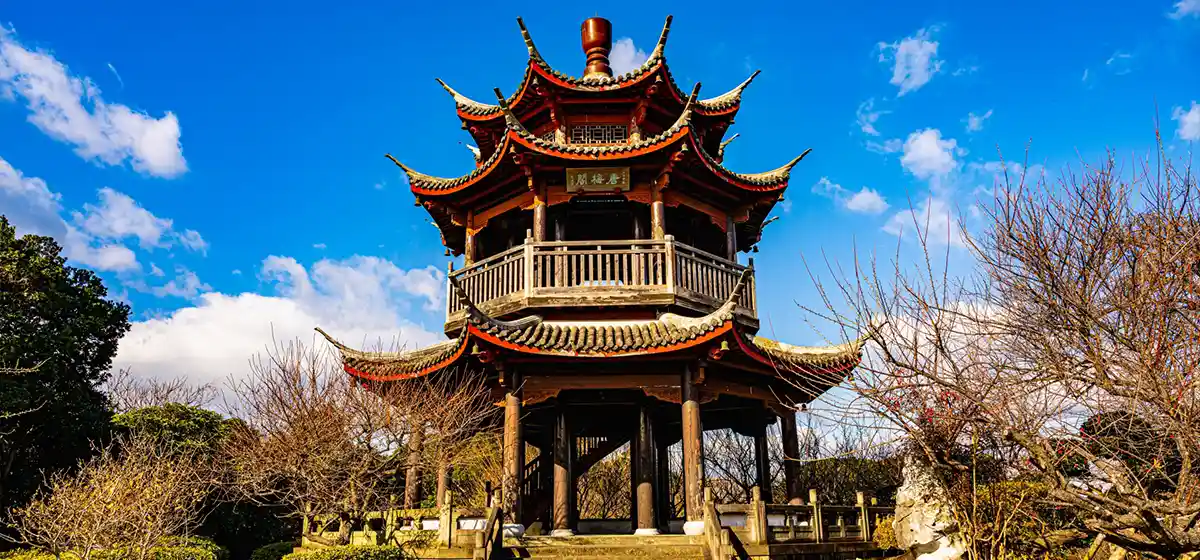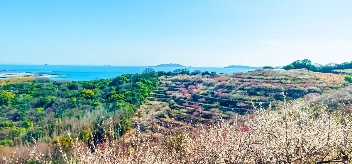 瀬戸内海が一望できる風光明媚な景観と中国風の建物が異国情緒を漂わせる公園です。園内には、日本をはじめ、中国、韓国、台湾等、各国の梅約315品種、1,250本が植えられています。