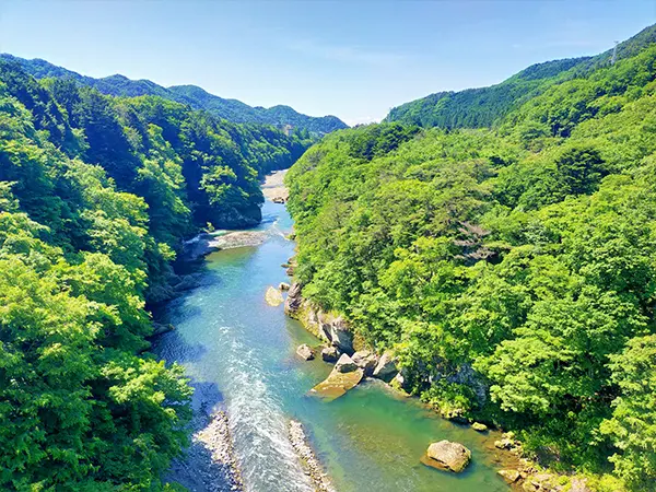 瀬戸合峡は凝灰岩が侵食され生まれた峡谷で、切り立った岸壁が約2kmにわたって広がっており、峡谷内にある川俣ダム正面の岸壁に架けられた吊橋「渡らっしゃい吊橋」からの眺望も絶景です。