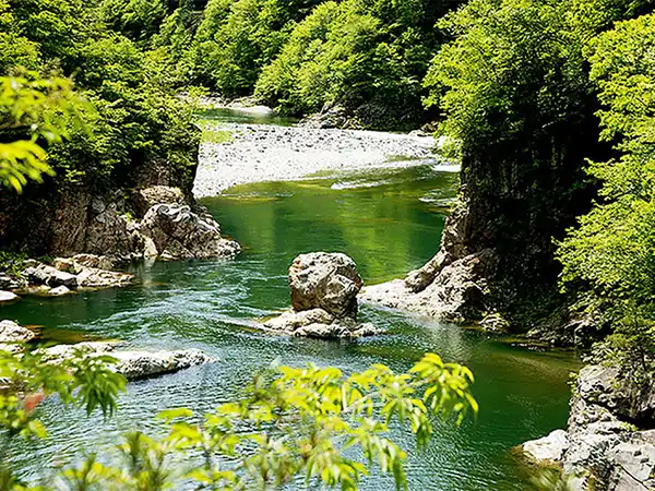 周辺には、緑溢れる豊かな大自然と岩肌鋭い渓谷とのコントラストなど、