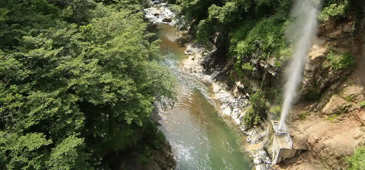 周辺には、緑溢れる豊かな大自然と岩肌鋭い渓谷とのコントラストなど、