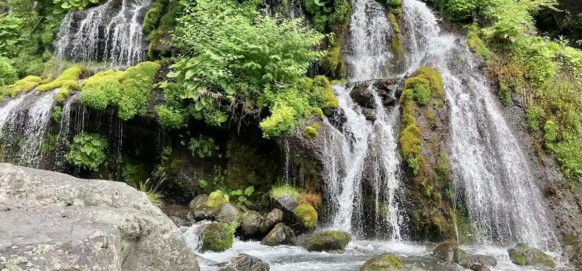 八ヶ岳の地下水が岩間から湧き出し、絹糸のように何段にも流れ落ちる優美な滝です。小さな滝が何段にも落ち込むその姿は、まるで竜が水を吐くかのように見えるためこの名が付いたと言われています。